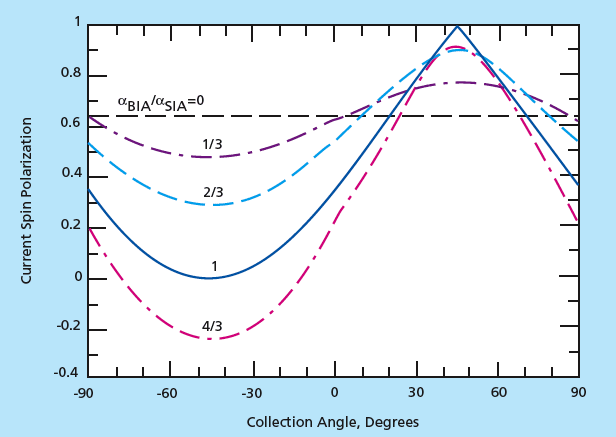 The theoretical calculations were performed using this model. It was found that when only SIA is taken into account, the theoretical upper limit of current spin polarization for a Rashba-effect resonant tunneling spin filter with a one-sided spin collector can be expected to be 2/π (about 63.7 percent), independent of the direction of the collector. When BIA was taken into account along with SIA, it was found that current spin polarization could be changed from the SIA-only value by varying the collection angle: in particular, the greatest and least polarization values were found to occur in the [110] and [11 - 0] directions, representing collection angles of +45° and -45°, respectively.