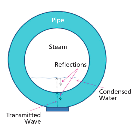 An algorithm for analyzing wave reflections and time-of-flight ultrasonic pulse-echo data has been developed for monitoring the health of steam pipes to determine the height of condensed water through the wall in real time, at temperatures up to 250 °C.
