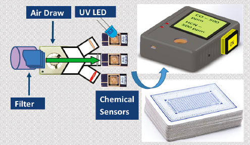 Each chip contains arrays of microsensors fabricated on a semiconductor die the size of a postage stamp using techniques similar to those used for manufacturing electronic integrated circuits (ICs). The sensors have excellent sensitivity with no cross-sensitivity to other gases, with significant reduction in SWAP (Size-Weight-And-Power) and cost.