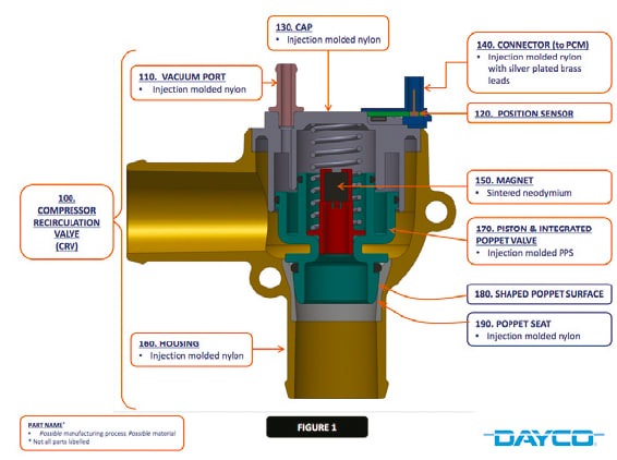 Two common problems with turbocharging systems are noise and turbo lag. Closure, or partial closure, of the engine throttle while the turbo compressor is operating at high boost condition can cause excessive back pressure on the compressor, creating a condition called surge. This variable flow compressor recirculation valve enables precise control of the boost pressure. Features include a shaped valve surface and position feedback through a position sensor, which picks up valve position through the magnetic field created by a magnet housed in the valve. Control of the valve position allows better control of the boost pressure, which in turn allows the minimum amount of pressure relief required to prevent surge.