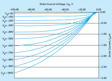 Enhancement of the drain-source current is clearly seen as a function of increasing gate bias in Fig. 2. In this case, an Ion/Ioff ratio of 44 was determined at Vds = -100 V, with Vg = 0 (Ioff) and Vg = -100 V (Ion). A carrier mobility of µ ≈ 0.007 cm2/V-s was also estimated from the data.