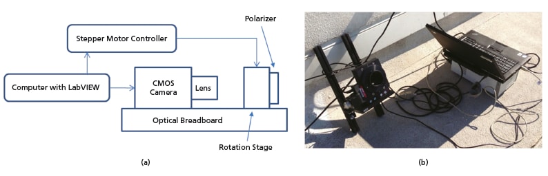 An experimental setup used to acquire actual images of the sky consisted of a monochrome CMOS (complementary metal oxide semiconductor) camera, in front of which is a laminated film polarizer mounted on a motorized rotation stage. Both the camera and stage were controlled by a computer (see figure). At every observation time, six images were taken, each with a different polarizer orientation. Results of field testing with the Sun sensor indicate an accuracy of approximately 1°.