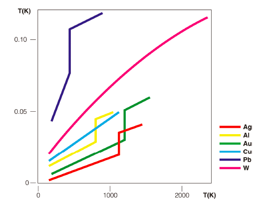 Heating the steel with a shorter wavelength laser beam causes an increase in lattice vibrations (phonons). This, in turn, increases the probability that the excited electrons in the cloud will contribute their excess energy to the lattice (i.e., absorption), as opposed to re-emitting their excess energy (i.e., reflection). This phenomenon can be extended to many other metals as demonstrated by Prokhorov, et al. in Figure 5[2]. This figure shows a linear increase in the absorptivity of several pure metals as temperature is increased. The stepwise increase in absorptivity that is shown for several of the metals occurs at their melting points.