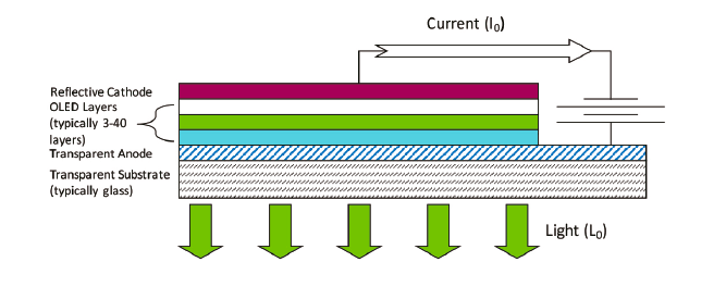 Today’s highest performing OLED lighting panels are manufactured by coating thin transparent substrates (currently predominantly thin rigid glass less than 1mm thick) with a transparent conductor (typically the anode) followed by vacuum evaporation of multiple functional carbon-based organic layers and finally vacuum deposition of a reflective metal cathode. Additional manufacturing steps include encapsulation of the OLED to protect it from moisture, internal and/or external light extraction layers to reduce light trapped inside the OLED and increase efficiency, and attachment of electrical connectors to the anode and cathode. The electrical connectors are typically 2 wires with or without a commercially available connector. The final OLED lighting panel is nominally less than 2mm thick with active layers less than 1 micron thick.