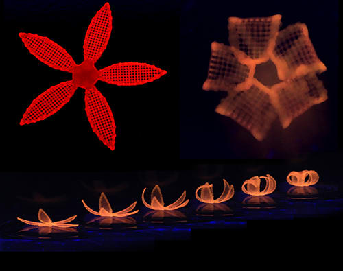 In nature, flowers and plants have tissue compositions and microstructures that result in dynamic morphologies that change according to their environments. Mimicking the variety of shape changes undergone by plant organs such as tendrils, leaves, and flowers in response to environmental stimuli like humidity and/or temperature, the 4D-printed hydrogel composites developed by Lewis and her team are programmed to contain precise, localized swelling behaviors.