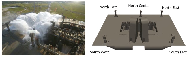 Several test cases have been performed. Water can be rejected through the nozzle by plunger, of which the motion is described by acceleration, velocity, or position. Simulation results of water flow through an actual rainbird nozzle matched predictions obtained from other methods such as 1D projectile and Volume of Fluid (VOF) analyses. During a nominal launch, water spray gradually develops over the exhaust hole, and the launch vehicle already lifts off when the water flow is fully developed and completely covers the hole. There might be some water splashing off the deck and sprinkling on the rockets; however, the impact is minimal and acceptable.