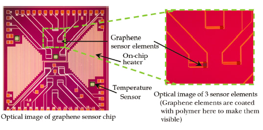 Sultana: For these chemical sensors, we’re doing four probe measurements. We apply a small current and measure the voltage drop across the graphene element. The voltage drop is proportional to the resistance of graphene. When our target gas molecules adsorb onto graphene, the resistance changes. It’s a very simple electrical measurement, which makes these devices robust.