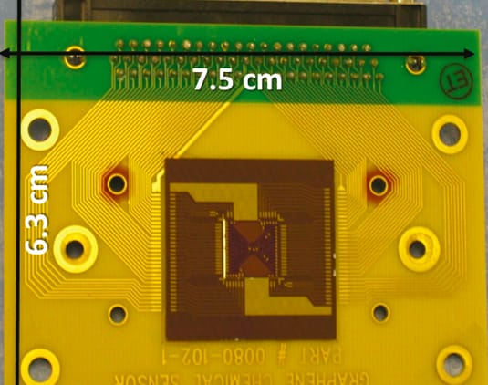 Sultana: These are very small sensors. Our first prototype is about a 1-cm by 1-cm chip, with ten sensing elements. You can actually fit a lot more sensor elements than that; we haven’t optimized the real estate yet. These are tens-of-microns-sized sensors that have leads or contact lines. We basically wirebond those contacts to a printed circuit board. Then, you can use a pin connector to read off the data.