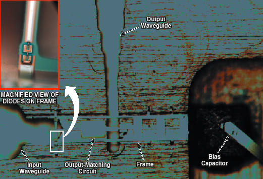 Thus far, two types of frequency-doubler circuits, designed for output frequencies of 200 and 400 GHz, respectively, have been designed, fabricated, and tested (see figure). Notwithstanding a need for further iteration to optimize design, the results of the tests are encouraging: For example, in a test in which the input frequency ranged from 179 to 212 GHz, one of the 400-GHz units exhibited a peak efficiency and peak power of ≈15 percent and ≈6 mW, respectively, at an output frequency of 369 GHz at room temperature. This represents a new performance record from planar Schottky diode varactors at this frequency.