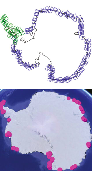 The continent-wide Landsat survey identified 26 colonies previously unknown and unreported in the literature. In addition, regional analysis found several areas where the Landsat retrievals indicate populations that are significantly larger than published estimates. The principal results of this are illustrated in the figure, and can be visualized by using Google Earth. A kmz formatted file containing geographic overlays of colony images retrieved from Landsat 7 data (along with colony spatial area and other information) can be obtained at this URL: http://tinyurl.com/kmjh4tb .