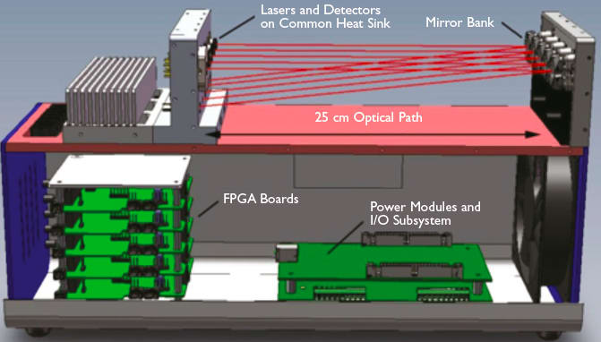 To achieve maximum sensitivity with a small, robust design, the five-channel sensor uses a separate single-mode mid-infrared laser for each gas, with each laser wavelength selected to target strong absorption lines while avoiding interference from other molecules potentially found in manned spacecraft environments. Distributed-feedback laser sources were fabricated for this specific configuration using various semiconductor technologies, including a quantum cascade (QC) intersubband laser based on InP-matched semiconductor quantum well structures, an interband cascade (IC) laser based on type-II band-to-band transitions in GaSb-matched quantum wells, and GaSb-based type-I quantum well diode lasers. A heat-sink assembly accepts the five sets of dedicated lasers and matched detectors, and sits 25 cm from a mirror bank to create the 50-cm two-pass optical path. Dedicated electronics are used to simultaneously control the temperature of each source and detector with integrated thermoelectric coolers, and the ambient temperature and pressure are measured with onboard sensors to correct for absorption line broadening.