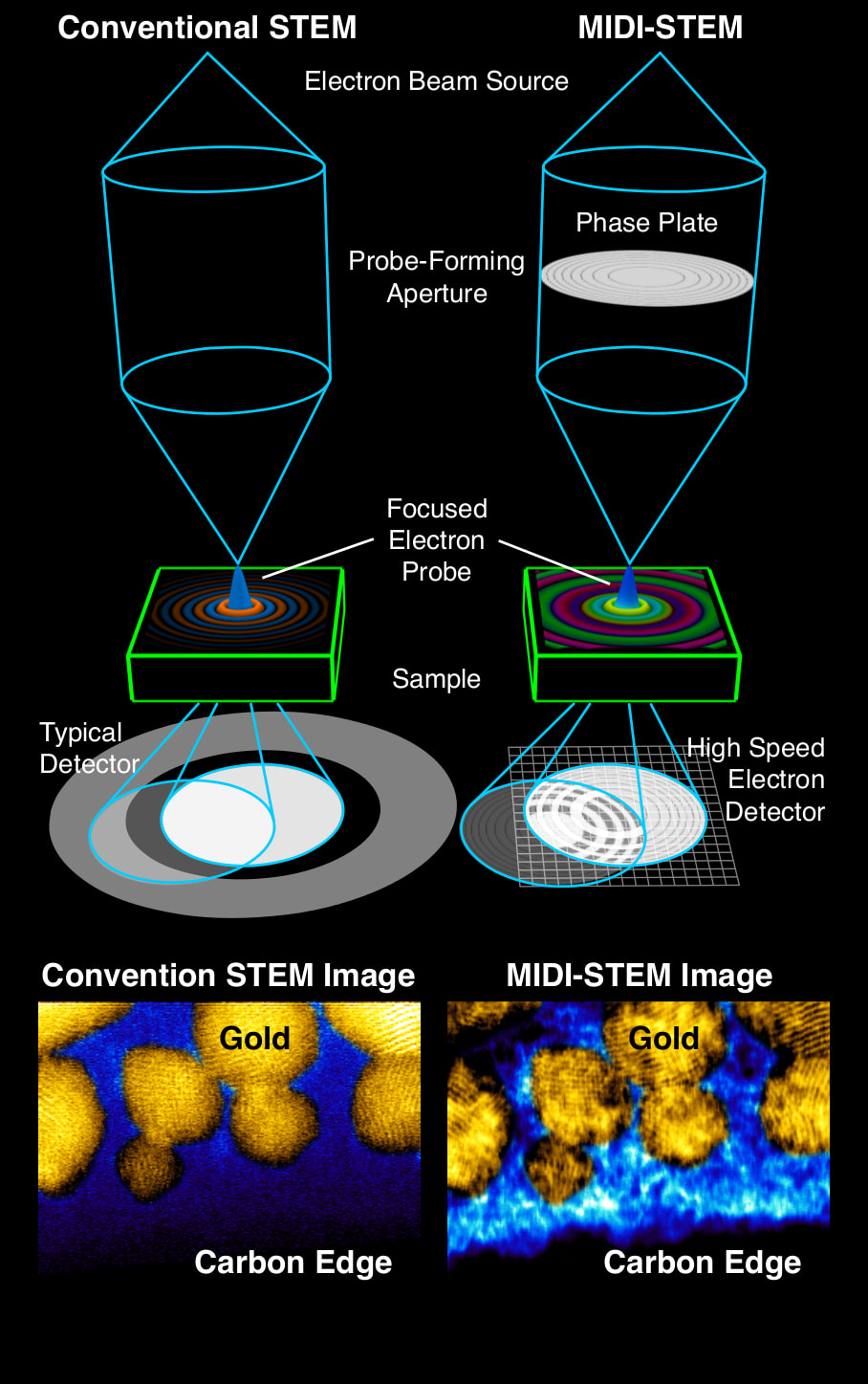 Scientists at the Department of Energy’s Lawrence Berkeley National Laboratory (Berkeley Lab) have developed a new imaging technique, tested on samples of nanoscale gold and carbon, that greatly improves images of light elements using fewer electrons. The newly demonstrated technique, dubbed MIDI-STEM, for matched illumination and detector interferometry STEM, combines STEM with an optical device called a phase plate that modifies the alternating peak-to-trough, wave-like properties (called the phase) of the electron beam.