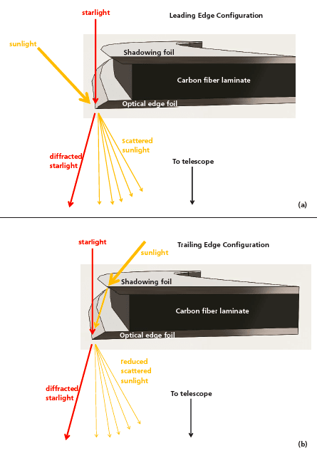 The solution is the use of thin, highly elastic, amorphous metal foils carefully shaped by a photo-chemical etching process. The combination of the manufacturing process and amorphous material inherently produces sharp edges that are sub-micron in radius. Two similarly shaped foils are bonded on either side of a thicker carbon fiber-reinforced polymer laminate for stiffening. The overall laminate is thermally balanced. One of the foils is slightly oversized with respect to the others, and is the “optical edge” layer. This layer’s sharp edge is the only edge encountered by the target star’s light on its way to the telescope. The undersized foil is referred to as the “dummy,” “shadowing,” or “baffle” layer.