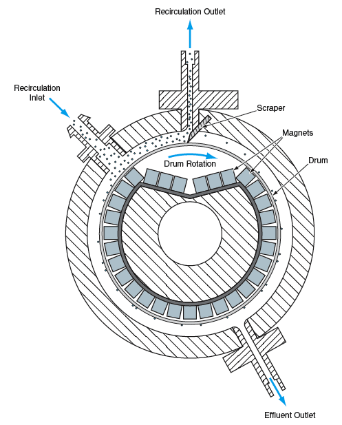 As the drum rotates, it carries the attracted sludge to the recirculation outlet; the decrease in the magnetic field at this location releases the sludge from the drum, making it possible for the sludge to be flushed out by the recirculation-outlet flow. A poly(tetrafluoroethylene) scraper aids in removing any remnants of sludge that may still stick to the drum. An effluent outlet is positioned as far as possible from the recirculation ports in order to provide the longest possible separation path. The effluent flow amounts to about 20 percent of the inlet flow. The flows of sludge and effluent are controlled by use of a recirculation pump and an effluent pump, respectively.