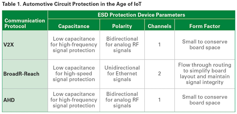 In the age of IoT, new protocols are being developed to promote safety and facilitate automobile-based communications. V2X is designed to help vehicles to communicate with the road and each other to prevent collisions and optimize traffic flow. BroadR-Reach and AHD are being developed to increase the speed and efficiency of high-speed data transmission, including high-definition video signals. Highly sensitive chipsets and demands for faster data require exceptional ESD protection for automotive modules that will utilize these new protocols. Low-capacitance, low-clamping ESD protection devices in a compact footprint will help make advanced automobile operation safe, reliable and efficient.