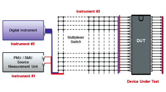 The basic test needs for digital and mixed-signal devices include DC/AC parametric and functional tests. For the DC tests, all of a device’s pins must be characterized, which requires a PMU. A PMU, which can source voltage/measure current or source current/measure voltage, must be able to access all of the device’s pins, which requires some type of switching/multiplexer if a single PMU is used. Once DC characterization is completed, functional/AC parametric testing of the device can be performed. In this case, a digital instrument with sufficiently deep memory, per-channel programmability (voltage, loads, and direction), programmable edge placement, and real-time compare provides the key features for testing AC parametrics and functionality. A basic setup that addresses these capabilities is shown in Figure 1.