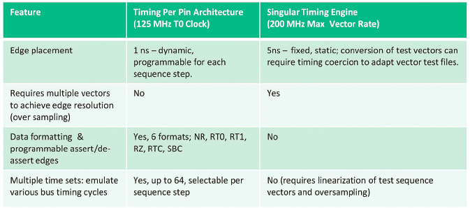 The table highlights the capabilities of the advanced PXI digital I/O digital subsystem with a timing per-pin architecture, compared to a singular timing architecture.
