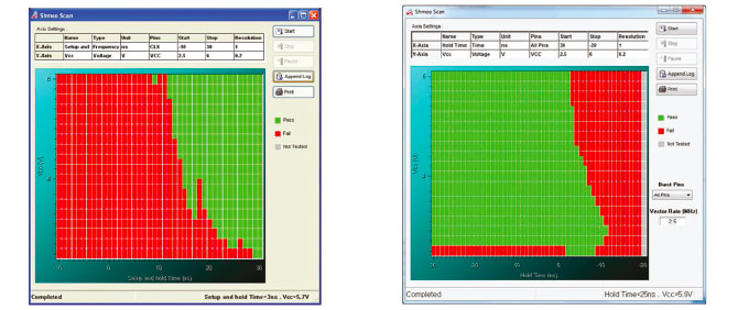 The solution to providing adequate timing resolution without resorting to 1-GHz or greater timing clock rates is to employ a dynamic timing interpolator, which provides the flexibility to position drive/sense test vectors anywhere within a test step with 1-ns or better resolution — not just on the vector clock’s edge boundary. This flexibility allows users to precisely create vector timing without resorting to work-arounds such as over-sampling, a technique that employs the use of multiple vectors in order to achieve even moderate edge placement resolution. In addition, the ability to “dynamically” program a pin’s timing vastly simplifies the creation/execution of timing Shmoo plots, validation/characterization of a device’s AC parametrics, and easier conversion of WGL, STIL, and VCD test vectors. Performing these tests with an instrument that supports only “static” timing per pin requires much longer test times and in some cases, the instrument’s capabilities may not be adequate for the application.