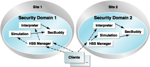 In the figure, the two ovals labeled Site 1 and Site 2 represent separate aerospace propulsion company network sites. The two ovals labeled Security Domain 1 and Security Domain 2 contain CORBA servers shown as boxes labeled HSS Manager, Interpreter, Simulation, and SecBuddy. The dashed arrows depict the flows of public information among these servers. The solid arrows depict the flows of delegated private information among these servers. The boxes outside the ovals in the figure represent CORBA clients. The HSS Manager at each site authenticates clients for access to specific security domains.