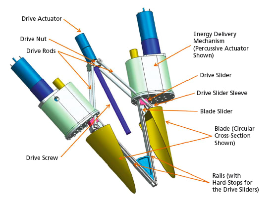 When end of travel on the linear slide is reached, and the maximum penetration depth is reached, planar edges of the two blades come in contact, enclosing the collected sample. The blades can be retracted for sample transfer or can be changed out for an additional sampling event using different blades. The blade design parameters can be optimized such that the two lids form a disk when in contact with each other along the straight edges. This configuration would allow easier tool alignment for sample transfer and encapsulation. The blades can be integrated into a percussive bi-blade sampler or any other bi-blade sampler using a different energy delivery method.