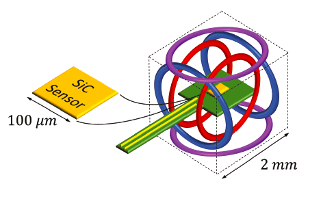 The crystalline nature of the 4H-SiC diode allows for a sharp magnetoresponse to be detected at precisely zero Gauss and at symmetrically spaced, electron- nuclear hyperfine interactions. These hyperfine responses may serve to self-calibrate the magnetometer as they are virtually independent of temperature and tremendously stable over long periods of time. The sharpness and high SNR of the magneto-response will allow for sensitivities below 100 pT/Hz½ to be achieved, making the technology competitive with the fluxgate and optically pumped He heritage designs. However, the SiC magnetometer’s purely electrical design is simpler to implement as it does not require inductive sensing elements, high-frequency radio, or optical circuitry that requires stable temperatures for operation. As only a single diode (sensing area 2) is required for simultaneous measurement of three magnetic axes, the technology can be made significantly more compact and lightweight than heritage instruments. Thus, the technology is well suited for swarms of picosats capable of science returns not possible with a single large-scale satellite. Additionally, the 3.3eV bandgap of 4H-SiC makes the material inherently rad-hard and allows for operation in temperatures of over 500 °C. This robustness allows for operation in the harsh environments of the Venusian surface and radiation belts of Jupiter.