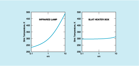 Figure 2. The Sink Temperature of a test object as a function of α/ε was calculated for a representativecase of heating with a quartz infrared lamp at 10-percent power and a representative case of a slat heaterbox occupying a third of the field of view, with an emissivity of 0.865 and slat temperature of 410 K. Slat heater boxes offer an important advantage over the infrared lamps that have been previously used to obtain desired sink temperatures: In comparison with an infrared lamp, a slat heater box provides a greater degree of sink temperature uniformity for a test-object surface that includes multiple areas with differing optical properties. This advantage can be seen by solving gray-body radiation equations for some representative cases of test objects for which the emissivity or absorptivity at wavelengths <4 μm (denoted α) differs from the emissivity or absorptivity at wavelengths >4 μm (denoted ε). [The term α is often denoted solar absorptivity because most of the power of solar radiation lies in the wavelength range below 4 μm, while the term ε is often denoted infrared or thermal emissivity because most of the power of room-temperature objects lies in the wavelength range >4 μm.] Figure 2 presents the results of one such calculation that illustrates the superiority of a slat heater box over an infrared lamp, in that the sink temperature is much less sensitive to α/ε in the case of the slat heater box.