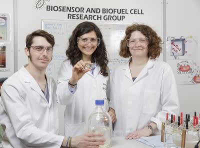 This novel fuel cell measures one inch square in size and uses a carbon catalyst at the cathode, which is derived from glucose and ovalbumin, a protein found in egg white. This biomass-derived catalyst is a renewable and much cheaper alternative to platinum, commonly used in other microbial fuel cells. By stacking multiple units together, the power is proportionally increased.
