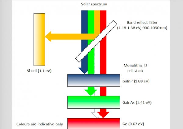 The record-setting UNSW mini-module combines a silicon cell on one face of a glass prism, with a triple-junction solar cell on the other. The triple-junction cell targets discrete bands of the incoming sunlight, using a combination of three layers: indium-gallium-phosphide; indium-gallium-arsenide; and germanium. As sunlight passes through each layer, energy is extracted by each junction at its most efficient wavelength, while the unused part of the light passes through to the next layer, and so on.