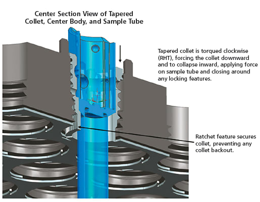 A tapered collet similar to a milling machine’s tool holder was designed with a threaded profile on its outer tapered diameter. When the collet is threaded into a corresponding non-tapered threaded hole, the collet collapses inward, applying a radial force on the sample tube within. The sample is retained within the collet by both friction force and any captured features designed into the sample tube’s OML (outer mold line). Ratcheting teeth on the collet ensure that it remains locked in place once a preloading torque is applied.