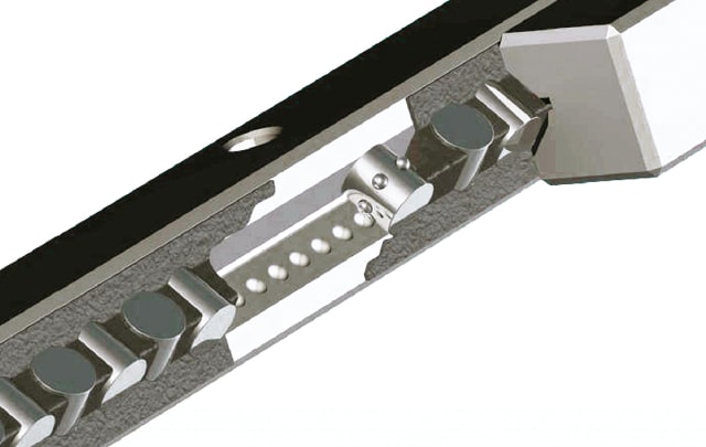 By placing studs in the center roller and machining a path along the rail, the retainer will never slip. It is suitable for high acceleration, vertical or horizontal mounting, and uneven load distribution.