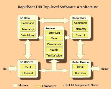 The software is implemented using a component-based architecture in C++, giving it strong reuse potential for future ISS missions. The protocols required by ISS are provided as an ISS payload interface. The software is currently hosted on a commercial Intel platform including a single custom board for the radar interface. Memory requirements are approximately 2 MB.