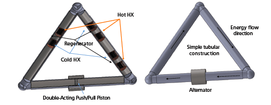 By using the engine’s reactive forces on the single double-acting piston, eliminating the use of hot moving displacers, and using multiple stages for acoustic wave phase adjustment, the single piston can oscillate at over 400 Hz without using heavy springs. At this high frequency, the output current can be minimized and the specific power is maximized. Moreover, since the engine is essentially an empty tube filled with helium, heat exchangers, regenerators, and a single non-contacting oscillating piston, the device does not require maintenance and is expected to be extremely reliable in addition to being low-cost and lightweight.