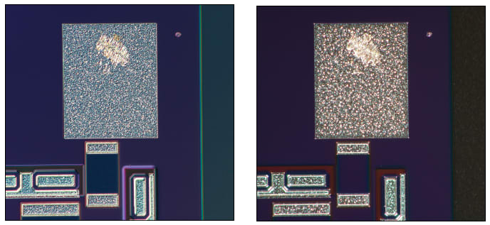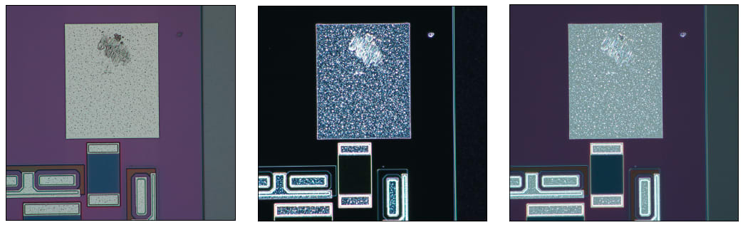 In many imaging cases, a sample with low contrast cannot be clearly observed. Even after enlargement, it can be difficult to clearly observe sample surface conditions with low reflective difference and low contrast. In other instances, glare caused by halation can disturb the sample surface, making it difficult to conduct a clear observation (Figure 1A). To eliminate this glare, illumination needs to be carefully adjusted, which can require considerable time and may still not produce satisfactory results.