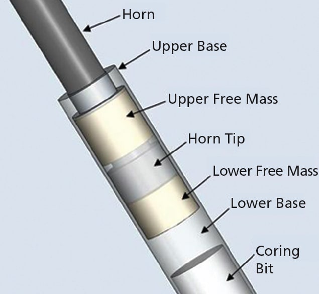 The horn hammers an object that is denoted the free mass because it is free to move longitudinally over a limited distance between hard stops: The free mass bounces back and forth between the ultrasonic horn and a tool bit (a drill bit or a corer). Because the longitudinal speed of the free mass is smaller than the longitudinal speed of vibration of the tip of the horn, contact between the free mass and the horn tip usually occurs at a phase of the vibration favorable to transfer of momentum from the horn to the free mass. Therefore, the free mass picks up momentum and is accelerated back to the tool bit. Upon impact of the free mass on the tool bit, momentum is transferred to the tool bit. The impacts of the free mass on the tool bit repeat at a sonic frequency that can range from tens of hertz to about 1 kHz. The shock waves caused by the impacts of the free mass propagate to the interface between the tool bit and the medium (typically, rock, ice, or other brittle material) to be drilled or cored. The medium becomes fractured when its ultimate strain is exceeded at the medium/tool-bit interface. This concludes the description of the principle of operation.