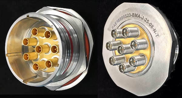Design engineers can now leverage the utility of a 38999 format high-speed RF connector in harsh environment applications, following PA&E's (Wenatchee, WA) release of its new hermetic 38999 BMA (Blind Mate Attach) RF connector line. These new high-performance BMA connectors are available in laser-weld or jam-nut configurations with 1, 2, 4, 6 or 8 contacts. Six key-way patterns and 11-80, 17-75, 21-48, 21-75, 23-06 and 25-08 shell sizes are also available. All formats provide RF performance of ≤1 db insertion loss at 18 GHz and have a hermetic leak rate of ≤1x10-9 cc He@1 ATM.
