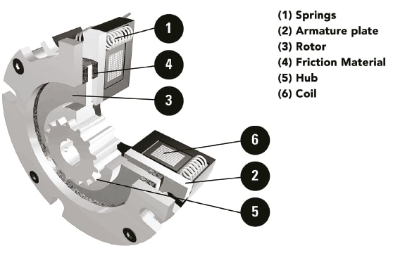 Energizing the coil produces the electromagnetic magnetic force that pulls the armature away from the rotor, freeing it to turn. Once operating, keeping the springs compressed requires only one-quarter of the initial voltage. If that voltage is removed accidentally or through normal shutdown, the spring decompresses and pushes the armature plate back against the rotor, once again producing the friction that brings the load to a stop or holds it in place.