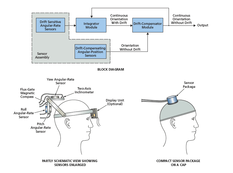 The inventive concept admits to variations too numerous to describe here, making it necessary to limit this description to a typical system, the selected aspects of which are illustrated in the figure. A set of sensors is mounted on a bracket on a band or a cap that gently but firmly grips the wearer's head to be tracked. Among the sensors are three drift-sensitive rotation-rate sensors (e.g., integrated-circuit angular-rate-measuring gyroscopes), which put out DC voltages nominally proportional to the rates of rotation about their sensory axes. These sensors are mounted in mutually orthogonal orientations for measuring rates of rotation about the roll, pitch, and yaw axes of the wearer's head.