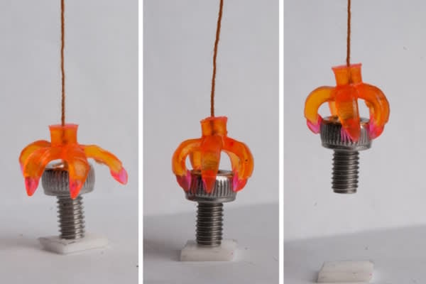 The material can bounce back to its original printed form within a specific temperature range — in this case, between 40 and 180 C. To demonstrate a simple application for the shape-memory structures, the team printed a small, rubbery, claw-like gripper. They attached a thin handle to the base of the gripper, then stretched the gripper’s claws open. When they cranked the temperature of the surrounding air to at least 40 C, the gripper closed around whatever the engineers placed beneath it.