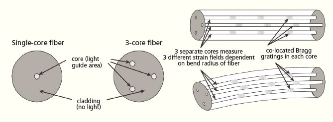 Multi-core optical fibers contain multiple light-guiding cores arranged symmetrically. Sensors, such as FBGs, are embedded into each of the cores (see figure, left). Such an arrangement allows for the measurement of strain in each core of the fiber at specific axial locations along the fiber. When a multi-core fiber is subjected to bending, the strain imposed in each core relative to one another is used to provide position information (see figure, right).