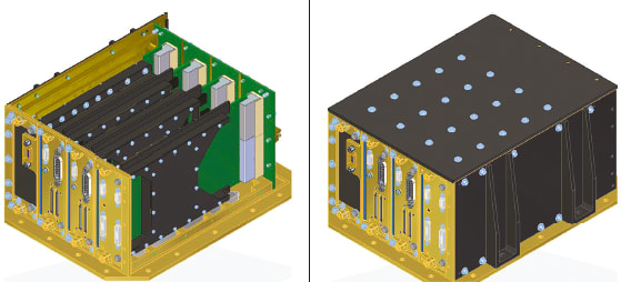 Renderings of the card view of the SpaceCube chassis design (left), and the enclosure design (right).