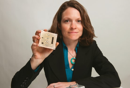 Goddard technologist Beth Paquette holds a 3 x 3” ceramic board with four radiation-hardened, digital-to-analog converter chips (in the middle of the board) created with a printing technique using silver ink. (NASA/W. Hrybyk)