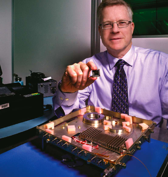 NASA laser expert Mike Krainak and his team plan to replace portions of this fiber-optic receiver with an integrated-photonic circuit, whose size will be similar to the chip he is holding. (NASA/W. Hrybyk)