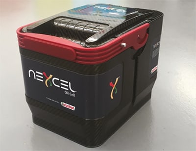 Castrol’s NEXCEL system is a sealed oil cell that contains both the engine oil and the oil filter, so it can be easily removed and replaced by hand in about 90 seconds versus 20 minutes for a conventional oil change. The sealed cell ensures that used oil is collected and handled safely, facilitating enhanced recycling and reuse of the waste oil into high-quality lubricants through a dedicated re-refining process.