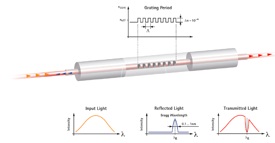 Optical fiber strain gauges based on fiber Bragg gratings (FBGs) operate on very different principles than those that govern traditional electrical strain gauges. In simplified terms, a fiber Bragg grating is a microstructure (typically a few millimeters long) created by modifying a standard single-mode telecom fiber, germanium-doped, with a UV laser. This microstructure creates a periodic variation in the refractive index of that optical fiber. As light travels along the fiber, the Bragg grating reflects a very narrow range of wavelengths; all of the other wavelengths are transmitted through the grating. The center of this band of reflected wavelengths is known as the Bragg wavelength (Figures 1 and 2). Under stress, the period of an FBG increases due to the physical stretching or compression of the optical fiber. This change results in a shift in the Bragg wavelength, which is then detected and recorded by the interrogator (i.e., data acquisition system).