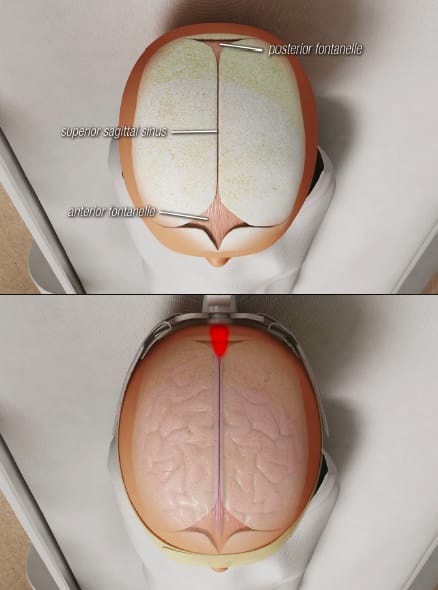 The superior sagittal sinus (SSS) is the largest dural venous sinus that runs down the middle of the brain. Noninvasix’s probe emits NIR light into the SSS, where it is absorbed by hemoglobin, which thermally expands as it is oxygenated. The pulse of NIR light generates a measurable acoustic signal from the oxygenated hemoglobin.