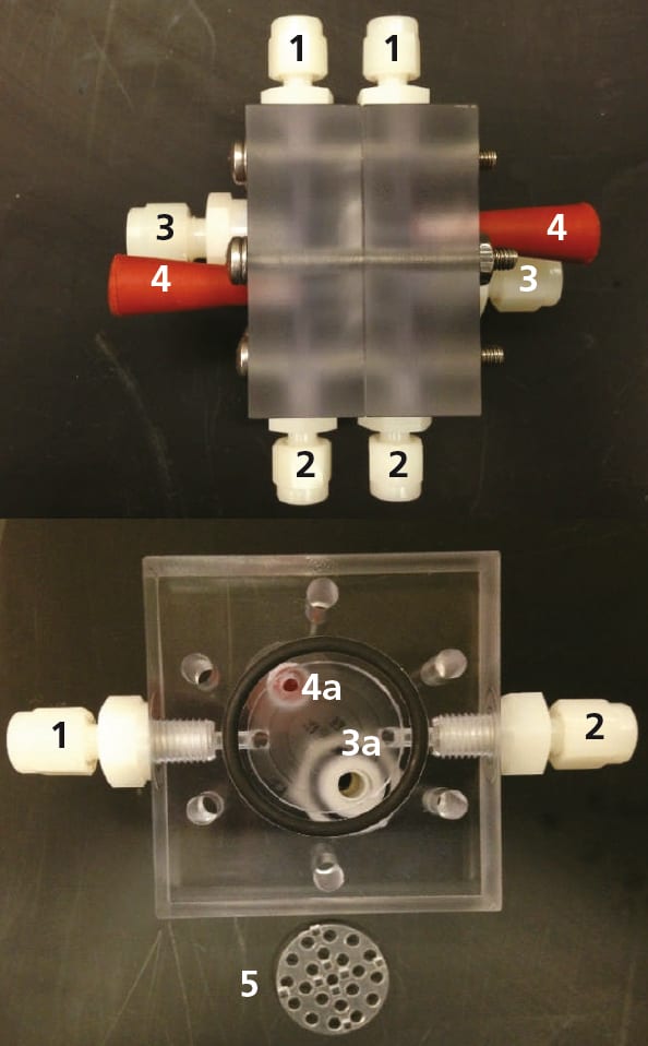Another cell that was evaluated was a commercially available, two-chamber glass cell with a glass frit separating the two halves of the cell. Several experiments were conducted using this cell, but several issues were identified, including gas leakage. Novel caps were fabricated for the cell to eliminate this issue, but the cell was damaged while preparing for an experiment, and no methane production data was collected for this cell design.
