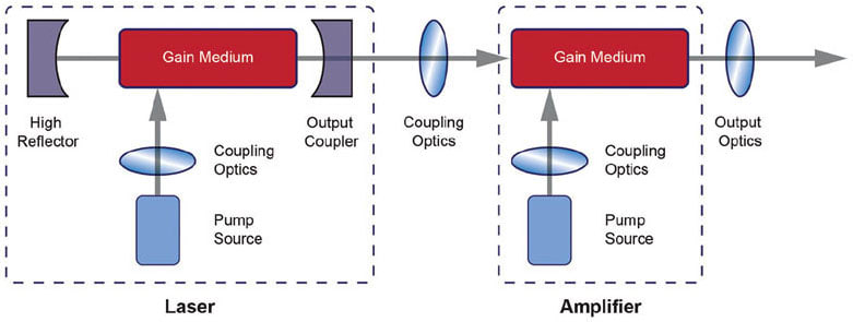 Figure 1 shows a schematic diagram of a generic laser system. All lasers are comprised of an optical gain medium housed in a cavity. A laser system may also include one or more amplification stages (additional gain media) that further increase the optical power. Key differences among laser designs include: