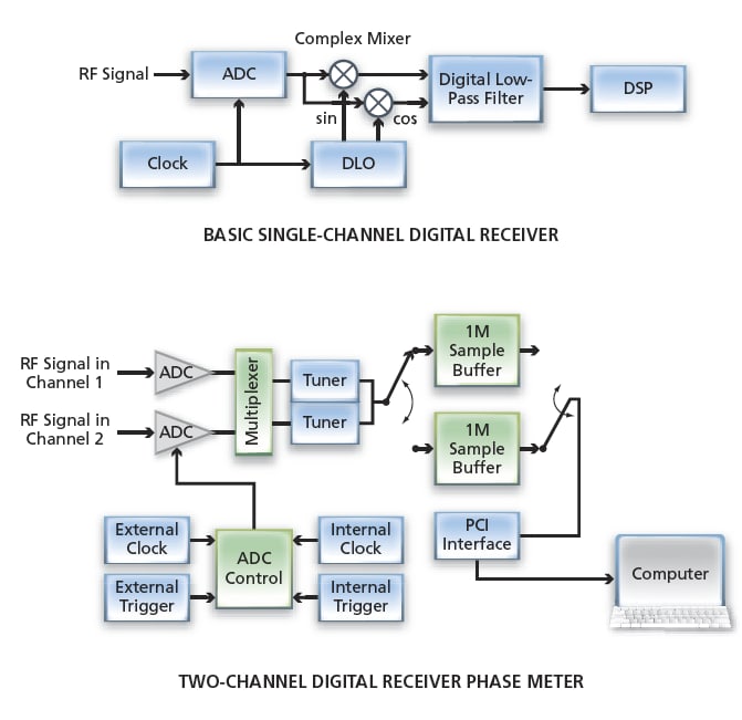 The specific commercially available two-channel digital receiver includes a dual-channel, 65-MHz, 14-bit peripheral component interface (PCI) bus dataacquisition card with a daughter board that contains a pair of narrow-band tuner integrated-circuit chips. The input stage of the card consists of two ADCs. In the tuner chips, input signals having frequencies up to 35 MHz can be translated to zero frequency, then digitally low-pass filtered to a bandwidth between 1 kHz and 1 MHz. The output samples of the tuner chips are fed to a two-part swap buffer. When each half of the swap buffer becomes filled up to a limit (e.g., 1M sample) specified by the user, the contents of the buffer are transferred, via PCI interface, to an external computer for further analysis.