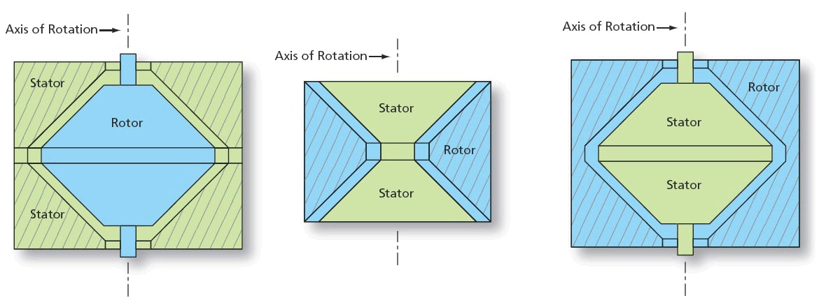 Conical Bearingless Motor/Generators both levitate and rotate the rotor with respect to the stators.These are simplified cross-sectional views of representative configurations of machines described in the text. Although stators traditionally enclose rotors, conical bearingless motor/generators lend themselves equally well to designs in which rotors enclose stators.