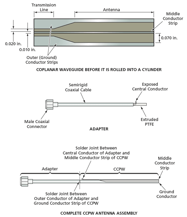 The antenna design is a hybrid of monopole-antenna and transmission line design elements. The antenna (see Figure 1) is formed from an open-ended coplanar waveguide in which the gap between the middle conductor strip and the two outer (ground) conductor strips tapers from (1) a smaller value more characteristic of a transmission line to (2) a larger value more characteristic of a leaky transmission line or an antenna. The coplanar waveguide is wrapped around a polytetrafluoroethylene (PTFE) tube, and its abutting edges are soldered together to form the cylindrical antenna structure, now denoted a cylindrical coplanar waveguide (CCPW), in which there is only one ground conductor. In operation, the wide-gap region between the middle conductor strip and the ground conductor permits radiation into the top side, while the larger ground side limits radiation on the back side.